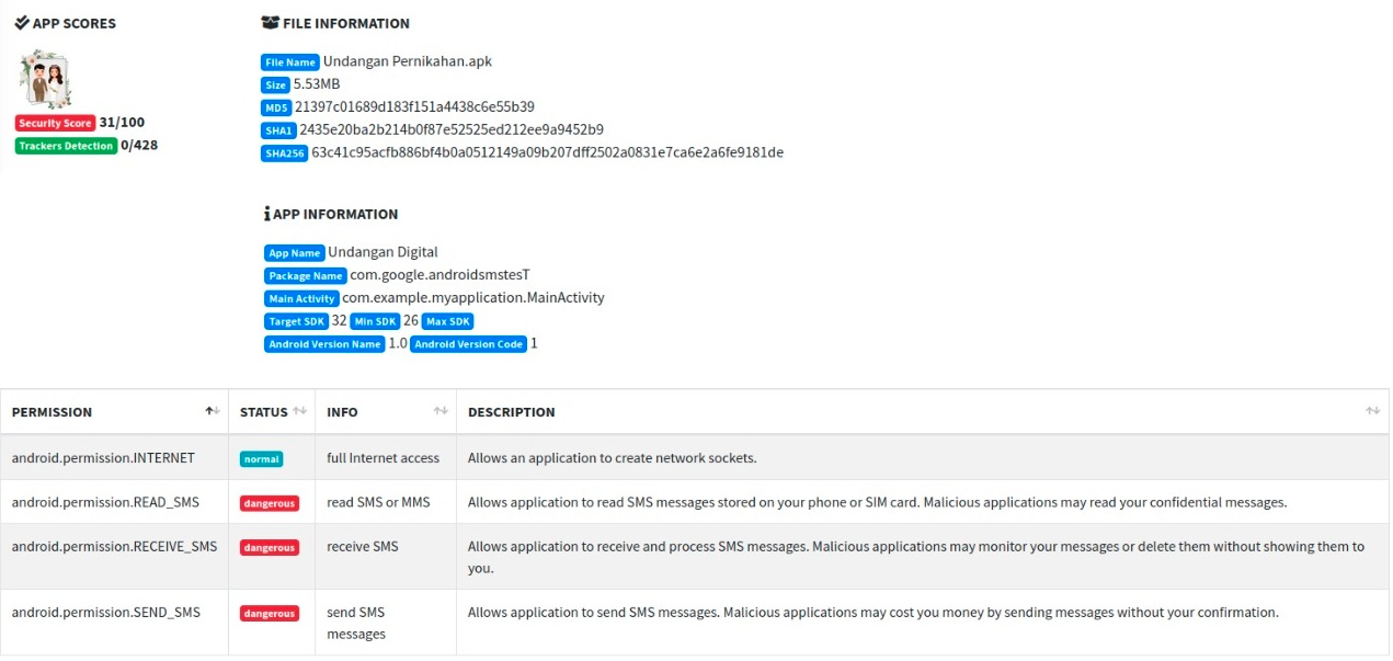 Hal sama juga disampaikan peneliti keamanan siber Adi Saputra, yang menyebut aplikasi "Undangan Digital" adalah sebuah modifikasi. Itu terlihat dari bagian package name: "com.google.androidsmstesT" .